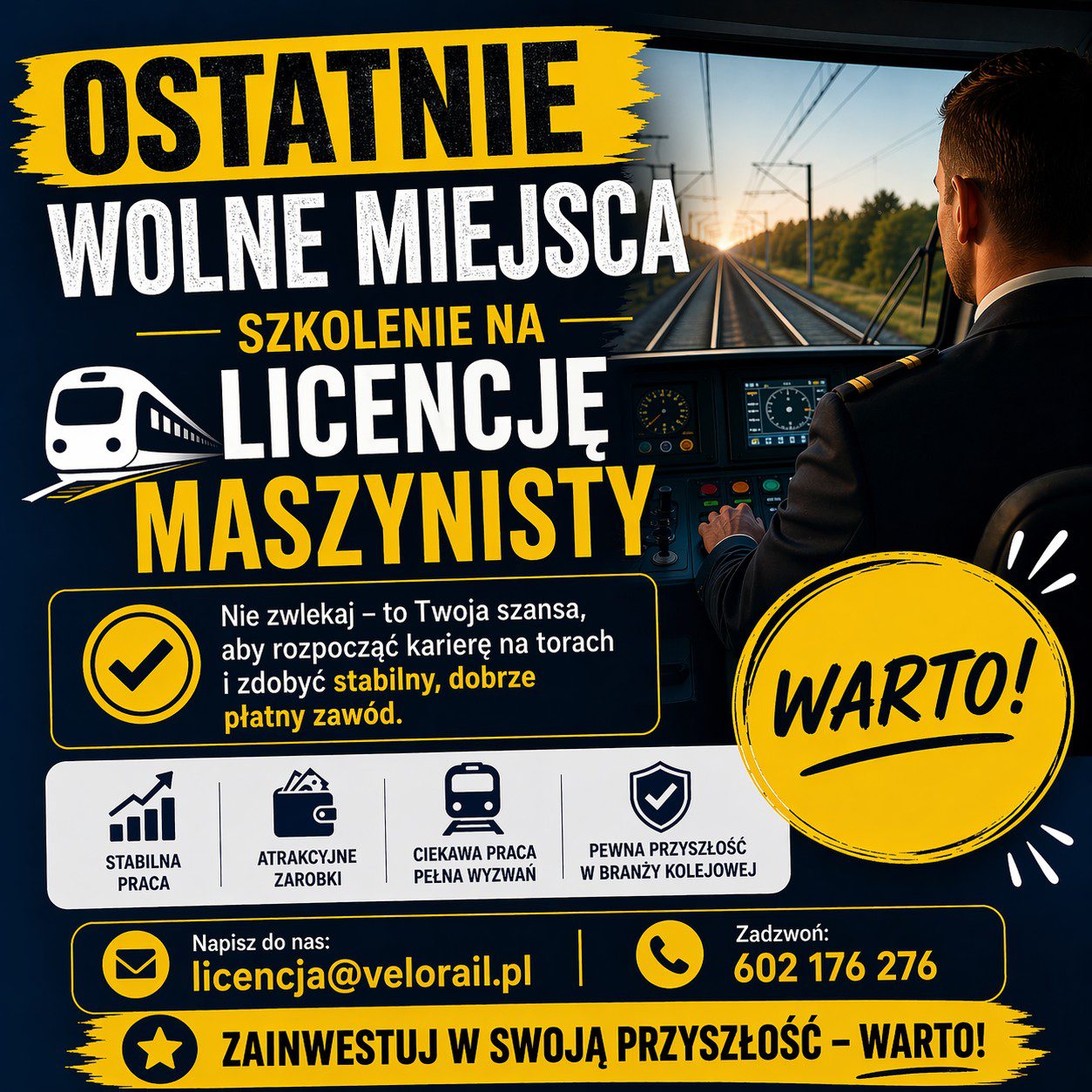 Marzysz o pracy, w której codziennie masz przed sobą tory, przygodę i odpowiedzialność? Velorail zaprasza na kurs na licencję maszynisty, który rozpocznie się 29 listopada 2025 r. w Białej Podlaskiej. Zajęcia prowadzone są w trybie weekendowym, dzięki czemu możesz zdobywać nowe kwalifikacje bez rezygnowania z pracy.W ramach szkolenia zapewniamy także…